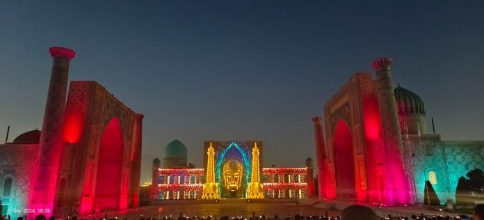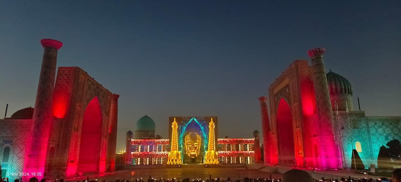 Samarqand, Uzbekistan, muisumut.or.id –3 November 2024,  Rombongan MUI Sumatera Utara sangat antusias menyaksikan pertunjukan proyeksi 3D spektakuler yang digelar setiap hari setelah magrib di Registan Square, Samarkand. Pertunjukan ini memukau ribuan penonton dengan menampilkan perjalanan sejarah melalui perpaduan musik dan cahaya di tengah situs bersejarah. Proyek ini merupakan program permanen dari pemerintah Uzbekistan untuk meningkatkan daya tarik wisata di Samarkand, kota yang telah lama dikenal sebagai salah satu pusat kebudayaan Islam.