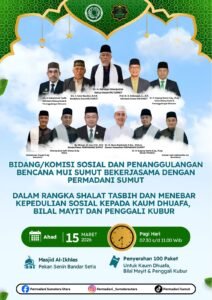 Deli Serdang, muisumut.or.id.  15 Maret 2026, Dalam rangka meningkatkan kesadaran masyarakat akan pentingnya kepedulian sosial dan memperkuat ukuwah islamiyah, Bidang/Komisi Sosial dan Penanggulangan Bencana (Sosben) MUI Sumatera Utara berkolaborasi dengan Persatuan Pemuda Dakwah Qurani (Permadani) Sumatera Utara mengadakan acara Sholat Tasbih, Dzikir, dan Doa agar Terhindar dari Bencana pada Ahad, 25 Ramadhan, 1447 H, 15 Maret 2026 M. di Masjid Al Ikhlas Pekan Senin, Bandar Setia, Percut Sei Tuan.