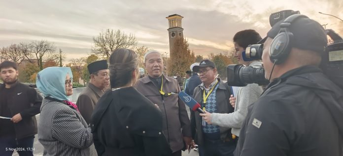 Tashkent, Uzbekistan, muisumut.or.id., 5 November 2025 – Dalam kunjungan ke Amir Timur Square di Tashkent, delegasi Majelis Ulama Indonesia (MUI) Sumatera Utara mendapat perhatian media lokal. TV Uzbekistan, salah satu stasiun televisi Dunyo bo‘ylab yang bercorak dokumenter di negara tersebut, mewawancarai Prof. Dr. Jamil, perwakilan dari delegasi MUI Sumut, yang berbagi pandangannya mengenai keindahan dan kekayaan budaya Uzbekistan, serta tujuan utama rombongan selama berada di negara Asia Tengah tersebut.