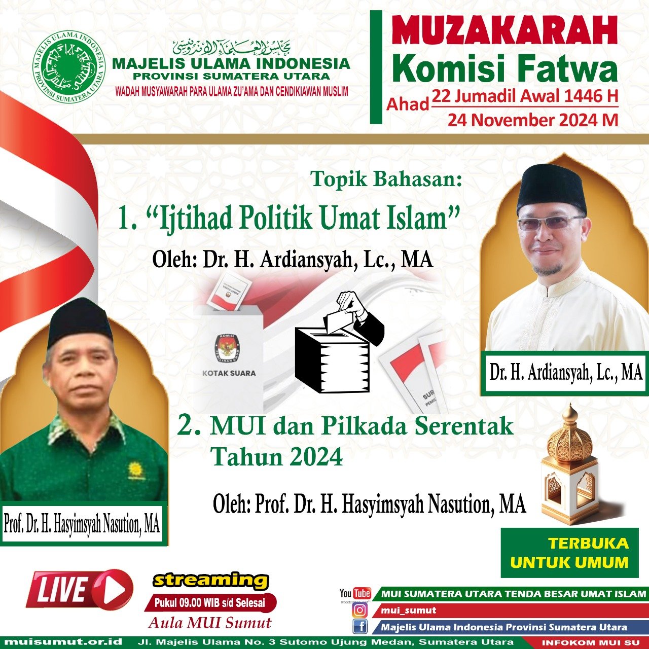 Medan, muismut.or.id.,  19 November 2024 – Majelis Ulama Indonesia (MUI) Provinsi Sumatera Utara melalui Komisi Fatwa menyelenggarakan Muzakarah pada Ahad 24 November 2024  bertajuk “Ijtihad Politik Umat Islam” di Aula MUI Sumut, Jalan Sutomo Ujung, Medan. Acara ini menghadirkan dua narasumber utama yang membahas isu strategis terkait peran umat Islam dalam politik dan pelaksanaan Pilkada Serentak 2024.