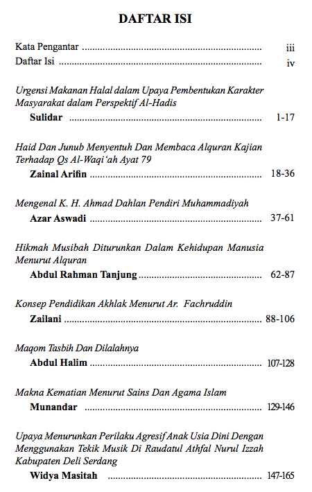 Adapun Jurnal Volume 3, no 1 Januari-Juni 2015 ini, mengulas pelbagai tema dalam kajian Islam, ada bidang Hadis yang ditulis oleh peneliti Hadis, yaitu Sulidar, yang membahas tentang Urgensi Makanan Halal dalam Upaya Pembentukan Karakter Masyarakat dalam Perspektif Al-Hadis. Selanjutnya dalam kajian Alquran, Zainal Arifin memaparkan tentang, Haid Dan Junub Menyentuh Dan Membaca AlquranKajian Terhadap Qs Al-Waqi‘Ah Ayat 79. Kemudian Abdul Rahman Rusli Tanjung, mengulas tentang Hikmah Musibah Diturunkan Dalam Kehidupan Manusia Menurut Alquran. Sementara itu, berkenaan dengan kajian tokoh Agama, Azar Aswadi membahas: dengan judul, Mengenal K. H. Ahmad Dahlan Pendiri Muhammadiyah. Dalam bidang kajian pendidi kan Islam, Zailani membahas tentang, Konsep Pendidikan Akhlak Menurut Ar. Fachruddin. Dan juga tentang pendikan Islam, Widya Masitah mengulas tentang Upaya Menurunkan Perilaku Agresif Anak Usia Dini Dengan Menggunakan Tekik Musik Di Raudatul Athfal Nurul Izzah Kabupaten Deli Serdang. Sedangkan kajian tentang tasawuf, ditulis oleh Abdul Halim, dengan judul; Maqom Tasbih Dan Dilalahnya, yang tak kalah pentingnya tulisan Munandar yang menyoroti tentang kematian dengan judul; Makna Kematian Menurut Sains Dan Agama Islam. Semua artrikel bertujuan untuk menambah wawasan keislaman dan mencerahkan umat Islam.