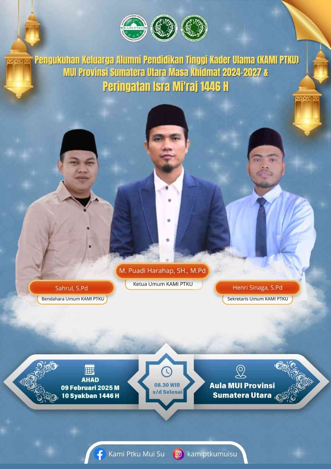 Medan muisumut.or.id – Keluarga Alumni Pendidikan Tinggi Kader Ulama (KAMI PTKU) Majelis Ulama Indonesia (MUI) Provinsi Sumatera Utara akan segera dikukuhkan untuk masa khidmat 2024-2027. Prosesi pengukuhan dijadwalkan berlangsung pada Ahad, 9 Februari 2025, bertepatan dengan 10 Syakban 1446 H, di Aula MUI Provinsi Sumatera Utara. Acara ini juga akan dirangkaikan dengan peringatan Isra Mi’raj 1446 H.