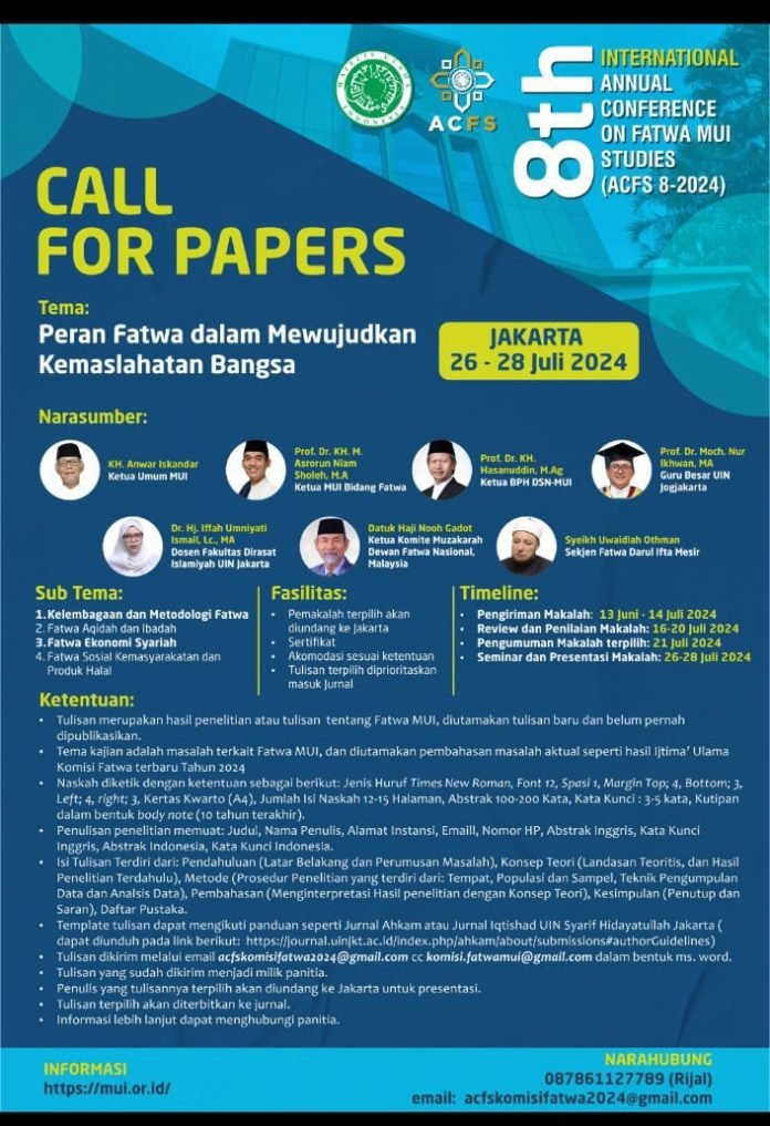 muisumut,or.id, Jakarta – Majelis Ulama Indonesia (MUI) akan mengadakan Konferensi Internasional Tahunan ke-8 tentang Studi Fatwa MUI (ACFS 8-2024) mulai tanggal 26 hingga 28 Juli 2024 di Jakarta. Tema konferensi tahun ini adalah “Peran Fatwa dalam Mewujudkan Kemaslahatan Bangsa,” yang bertujuan untuk mengeksplorasi dampak fatwa MUI terhadap masyarakat Indonesia.