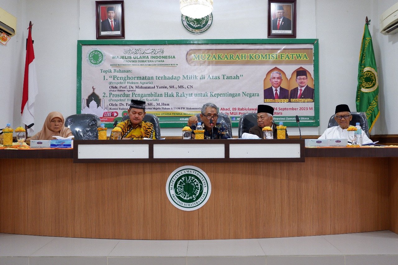 muisumut.or.id-Medan, Komisi Bidang Fatwa Majelis Ulama Indonesia Sumatera Utara menggelar muzakarah dengan tema “Prosedur Pengambilan Hak Rakyat untuk Kepentingan Negara Secara Perspektif Hukum dan Syariah.” Kegiatan berlangsung di Aula MUI Sumut pada Ahad (24/9).