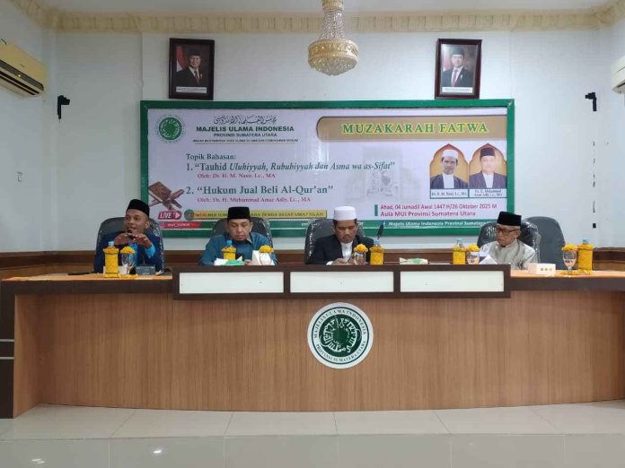 Medan, 26 Oktober 2025 – muisumut.or.id – Majelis Ulama Indonesia (MUI) Provinsi Sumatera Utara menggelar Muzakarah Fatwa pada Ahad, 26 Oktober 2025 di Aula MUI Sumut. Kegiatan ini menghadirkan Dr. H. Muhammad Nasir, Lc., M.A., Ketua Komisi Fatwa MUI Sumut, sebagai narasumber dengan pembahasan tema “Tauhid Uluhiyah, Rububiyah, dan Asma’ wa Sifat.”