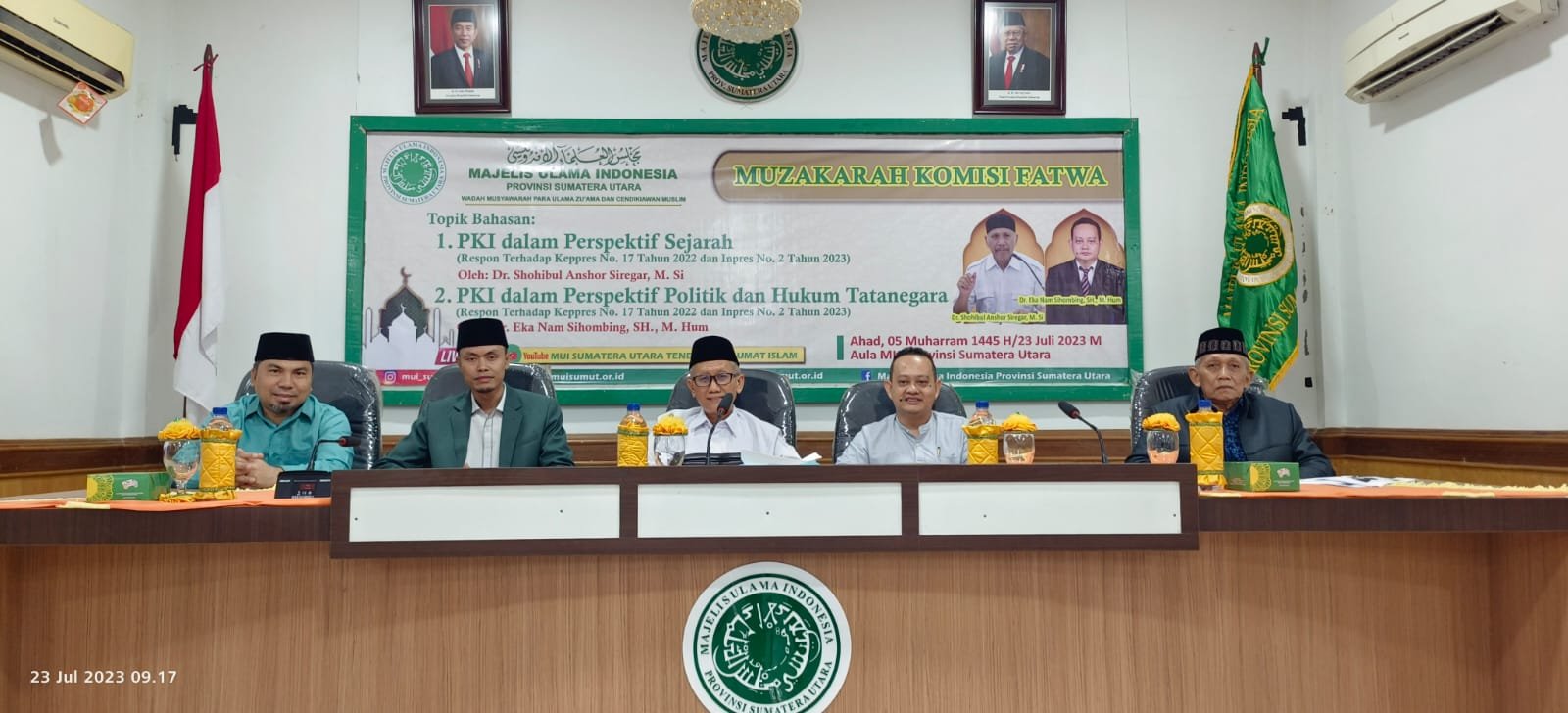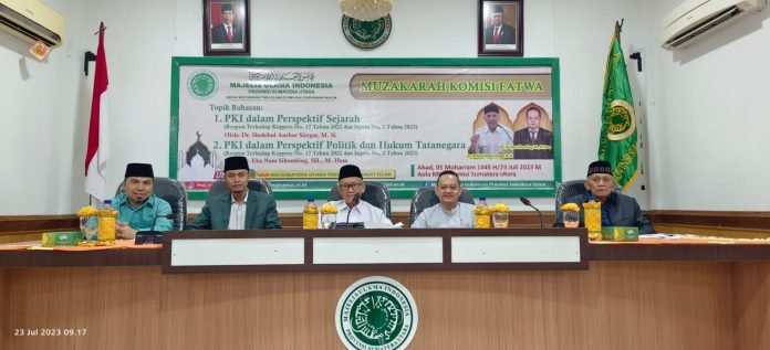 muisumut.or.id-Medan, Majelis Ulama Indonesia (MUI) Provinsi Sumatera Utara menyelenggarakan Muzakarah Rutin Bulanan yang kali ini membahas topik penting mengenai Partai Komunis Indonesia (PKI) dalam dua perspektif, yakni sejarah dan politik serta hukum tatanegara pada Ahad 23 Juli 2023 di Aula MUI Sumut. Muzakarah ini dipandu oleh Prof. Dr. H. Nawir Yuslem, MA., Wakil Ketua Komisi Fatwa MUI Sumut, dan dua narasumber ahli, yaitu Dr. Shohibul Anshor. M. Si. dan Dr. Eka Nam Sihombing, SH, M. Hum.