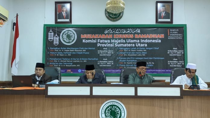 muisumut.or.id-Medan, MUI Sumut mengadakan Muzakarah Khusus Ramadhan pada Ahad (26/3) di Aula MUI Sumut. Acara dibuka oleh Ketua Umum MUI Sumut, Dr. H. Maratua Simanjuntak dan dihadiri oleh para peserta dari berbagai kalangan. Dalam pidatonya, Buya Maratua menekankan pentingnya menuntut ilmu dan berharap para peserta dapat fokus mendengarkan dan aktif dalam berdiskusi.