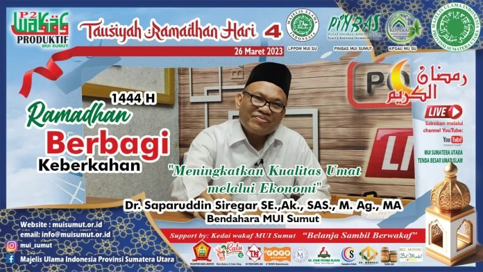 muisumut.or.id-Medan, Ceramah Dr. Saparuddin Siregar, SE., Ak, SAS, M. Ag., MA, yang bertajuk “Meningkatkan Kualitas Umat Melalui Ekonomi” telah disiarkan di kanal YouTube MUI Sumut pada 26 Maret 2023 menjelang berbuka puasa. Dalam ceramah tersebut, Dr. Saparuddin Siregar, Bendahara Majelis Ulama Indonesia Provinsi Sumatera Utara, mengajak para muslimin dan muslimat untuk merenungkan bagaimana meningkatkan kualitas umat melalui ekonomi.