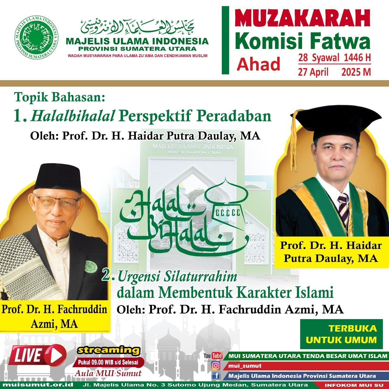 Medan, muisumut.or.id 27 April 2025 — Muzakarah Ilmiah Komisi Fatwa yang berlangsung pada Ahad, 27 April 2025 pukul 09.00–12.00 WIB. Acara ini menghadirkan narasumber Prof. Dr. Fakhruddin Azmi, M.A., yang membawakan materi bertajuk “Urgensi Silaturrahmi dalam Membentuk Karakter Islami”.