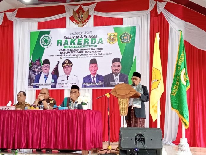 Sidikalang, muisumut.or.id., 12 November 2024 – Majelis Ulama Indonesia (MUI) Kabupaten Dairi menggelar Rapat Kerja Daerah (RAKERDA) tahun 2024 di Balai Budaya Kabupaten Dairi, Sidikalang, Selasa, 12 November 2024. Mengusung tema “Berkhidmat untuk Umat Meraih Ridho Ilahi,” acara ini mencerminkan komitmen MUI dalam melayani umat demi meraih keridhaan Allah SWT.