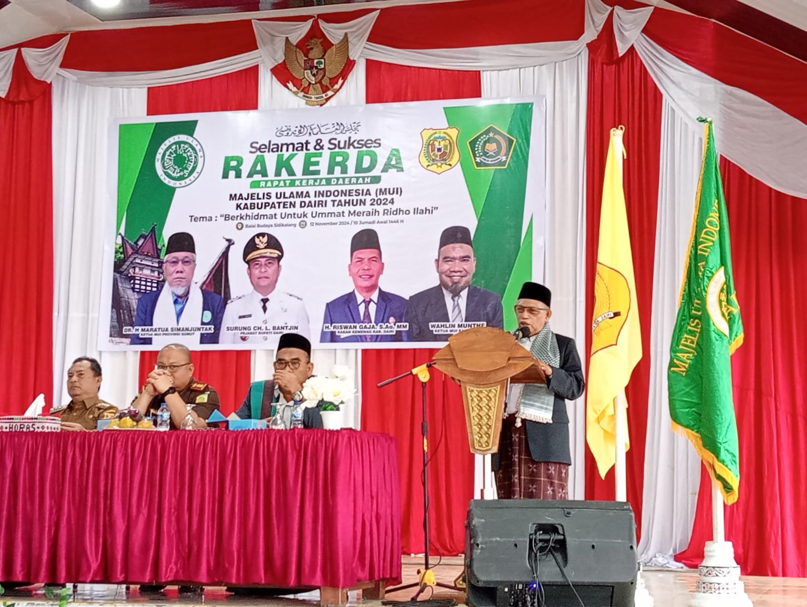 Ia menilai tema RAKERDA sangat relevan dan menginspirasi MUI Dairi untuk terus memperkuat pelayanan dalam peningkatan aqidah, ukhuwah Islamiyah, basyariyah, dan wathaniyah, sehingga menjadi komunitas teladan yang mencerminkan keluhuran ajaran Islam. Beliau mengapresiasi dukungan pemerintah yang terus berlanjut dan mendorong MUI untuk semakin mendekatkan diri sebagai mitra strategis pemerintah.
