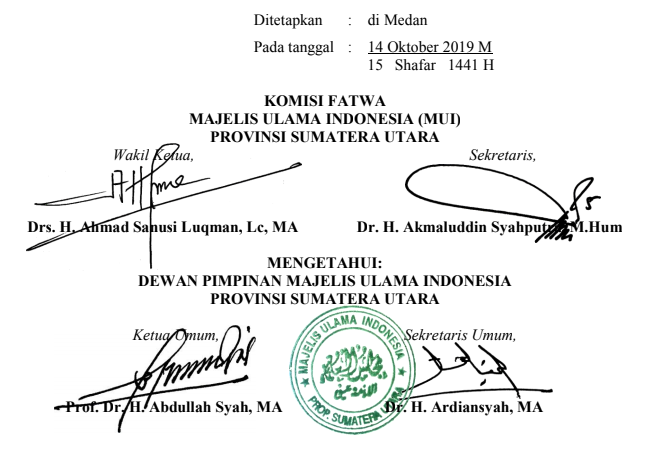 Demikian fatwa ini ditetapkan sesuai dengan hasil sidang musyawarah Komisi Fatwa Majelis Ulama Indonesia Provinsi Sumatera Utara dengan ketentuan apabila di kemudian hari terdapat kekeliruan dalam keputusan ini akan diadakan perbaikan sebagaimana mestinya.