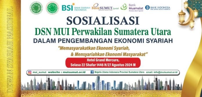 muisumut.or.id, Selasa, 27 Agustus 2024, Dewan Syariah Nasional (DSN) MUI Perwakilan Sumatera Utara menyelenggarakan acara sosialisasi bertema “Memasyarakatkan Ekonomi Syariah dan Mensyariahkan Ekonomi Masyarakat.” Acara yang dilaksanakan selama sehari penuh ddi Hotel Grand Mercure, menghadirkan ulama dan tokoh ekonomi syariah dari Jakarta dan Sumatera Utara.