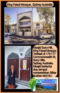 Alhamdulillah Nani Ayum juga menyerahkan Stiker Promosi Lingkungan Hidup Sosben MUI SU ke Masjid Surry Hill ,Masjid King Faisal Mosque. Terletak di 175-177 Commonwealth St, Surry Hills, Sydney, Australia. Nani Ayum mengatakan, kebetulan saya menghadiri Wisuda Putra kedua kami bersama Alm. H. Darul Aman Nasution yang pernah menjabat Ketua Komisi Fatwa MUI SU yaitu Ahmad Munif Hannani Nasution mendapat gelar Master of Applied Economics Macquarie University with Double Degree Universitas Brawijaya Malang Beasiswa Australia Awards Scholarships (AAS) pada Hari Rabu tanggal 6 Desember 2023 Macquarie University di Sydney. Tapi sayang tidak bisa berfoto bersamsa karena BKM Masjid tidak ada di tempat, yang ada hanya petugas kebersihannya yang berkebangsaan Bangladesh . Masjid Buka tutup sesuai jam waktu Sholat.