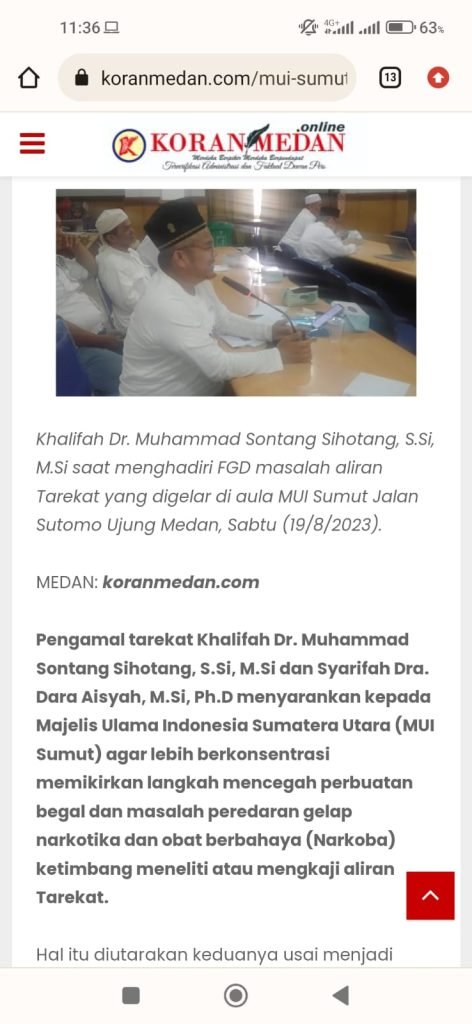 muisumut.or.id-Medan, Dalam sebuah laporan yang diterbitkan oleh KoranMedan.Online pada Sabtu, 19 Agustus 2023, terungkap bahwa Dr. Muhammad Sontang Sihotang S.Si, M.Si diduga telah memberikan pernyataan salah setelah mengikuti Forum Group Discussion (FGD) yang diadakan oleh Majelis Ulama Indonesia Sumatera Utara. Dalam laporan tersebut, Sontang menyarankan agar MUI Sumut lebih memusatkan perhatian pada langkah-langkah mencegah tindak kriminal, seperti perbuatan begal dan peredaran gelap narkotika dan obat-obatan berbahaya (narkoba), daripada meneliti/mendalami atau memahami aliran Tarekat.