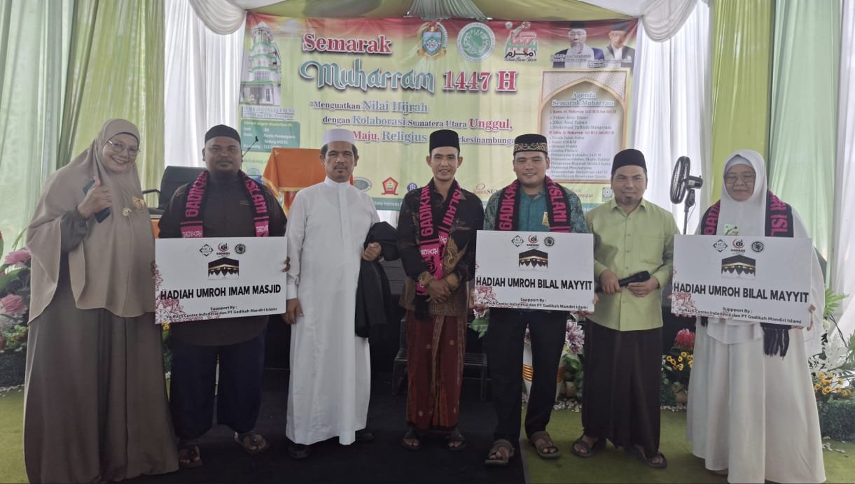 muisumut.or.id, Medan – 12 Juli 2025, Dalam momentum Puncak Peringatan Muharram 1447 H, Majelis Ulama Indonesia (MUI) Provinsi Sumatera Utara, berkolaborasi dengan Yayasan Hufaz Centre dan Gadika Mandiri Islam Travel, menyerahkan hadiah umrah kepada yakni imam masjid, bilal mayit laki-laki, bilal mayit perempuan, dan alumni terbaik Pendidikan Tinggi Kader Ulama (PTKU) MUI Sumut.