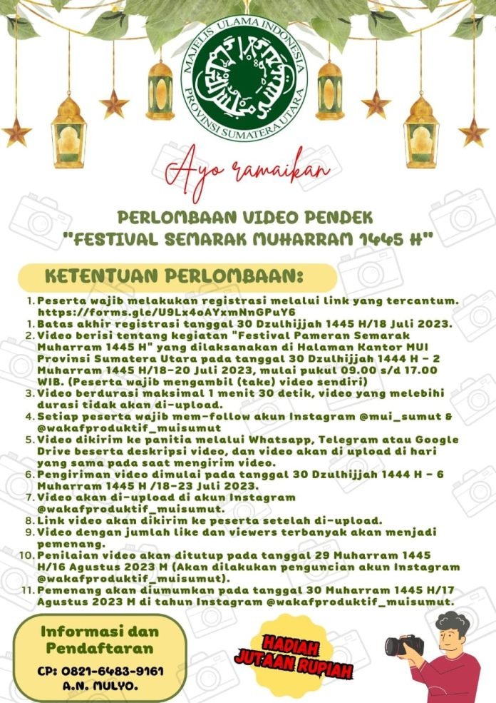 MUI Sumatera Utara mengundang semua individu yang berbakat dan bersemangat untuk bergabung dalam Perlombaan Video Pendek “Festival Pameran Semarak Muharram 1445 H”. Jadikan momen ini sebagai peluang untuk menunjukkan kreativitas Anda dan berpartisipasi dalam kegiatan yang memberikan inspirasi dan kebermanfaatan dalam masyarakat. (Yogo Tobing)